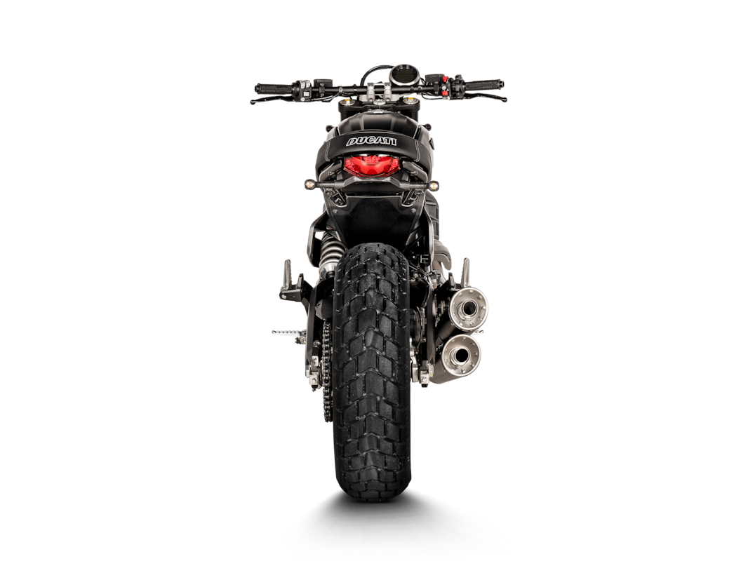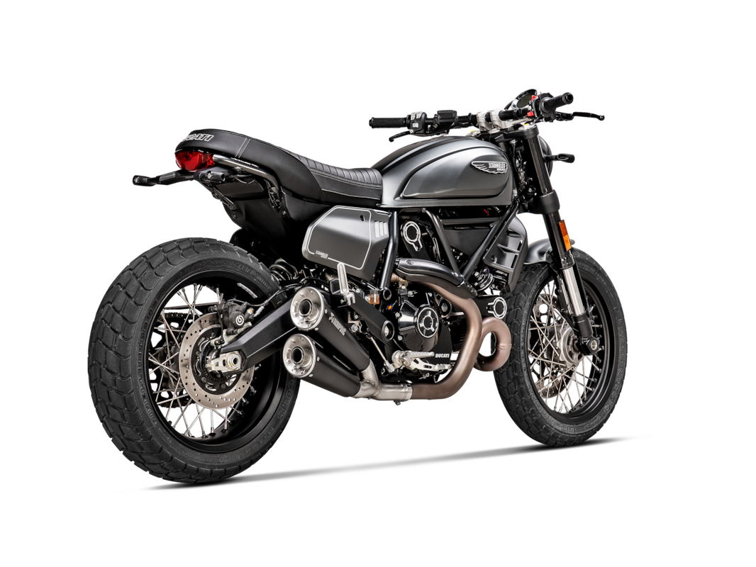 Son design optimisé pour la piste augmente la puissance de 1,6 kW (2,2 ch) à 8 600 tr/min et le couple de 3,0 Nm à 4 500 tr/min, selon les tests effectués sur le banc d’essai Akrapovič par rapport à un Scrambler équipé d’un échappement d’origine. Il offre une sonorité profonde, sportive et expressive . Simple à installer (plug and play) et ne nécessitant aucun réglage, ce système est compatible avec les versions Urban Motard, Nightshift, Icon, Icon Dark et Desert Sled du Ducati Scrambler.